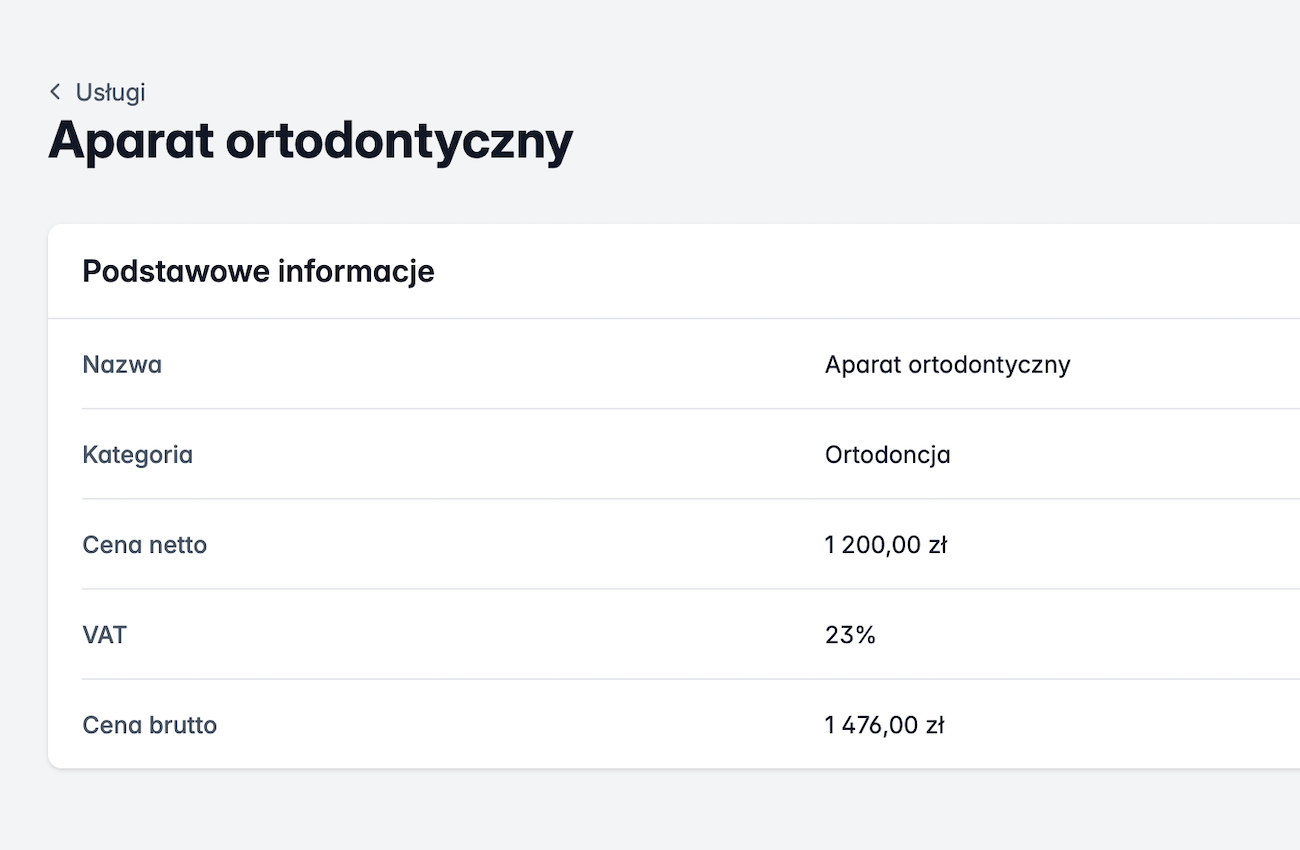 Dodaj do programu usługi, które są wykonywane przez Twoją pracownię. Uzupełnij podstawowe informacje - nazwę usługi, domyślną cenę oraz przypisz wielu techników z ich punktami za wykonanie pracy. Dodaj także wykorzystywane materiały (ma to znaczenie dla generowanych certyfikatów). Następnie, podczas dodawania sprzedaży odpowiednie dane zostaną podstawione automatycznie.